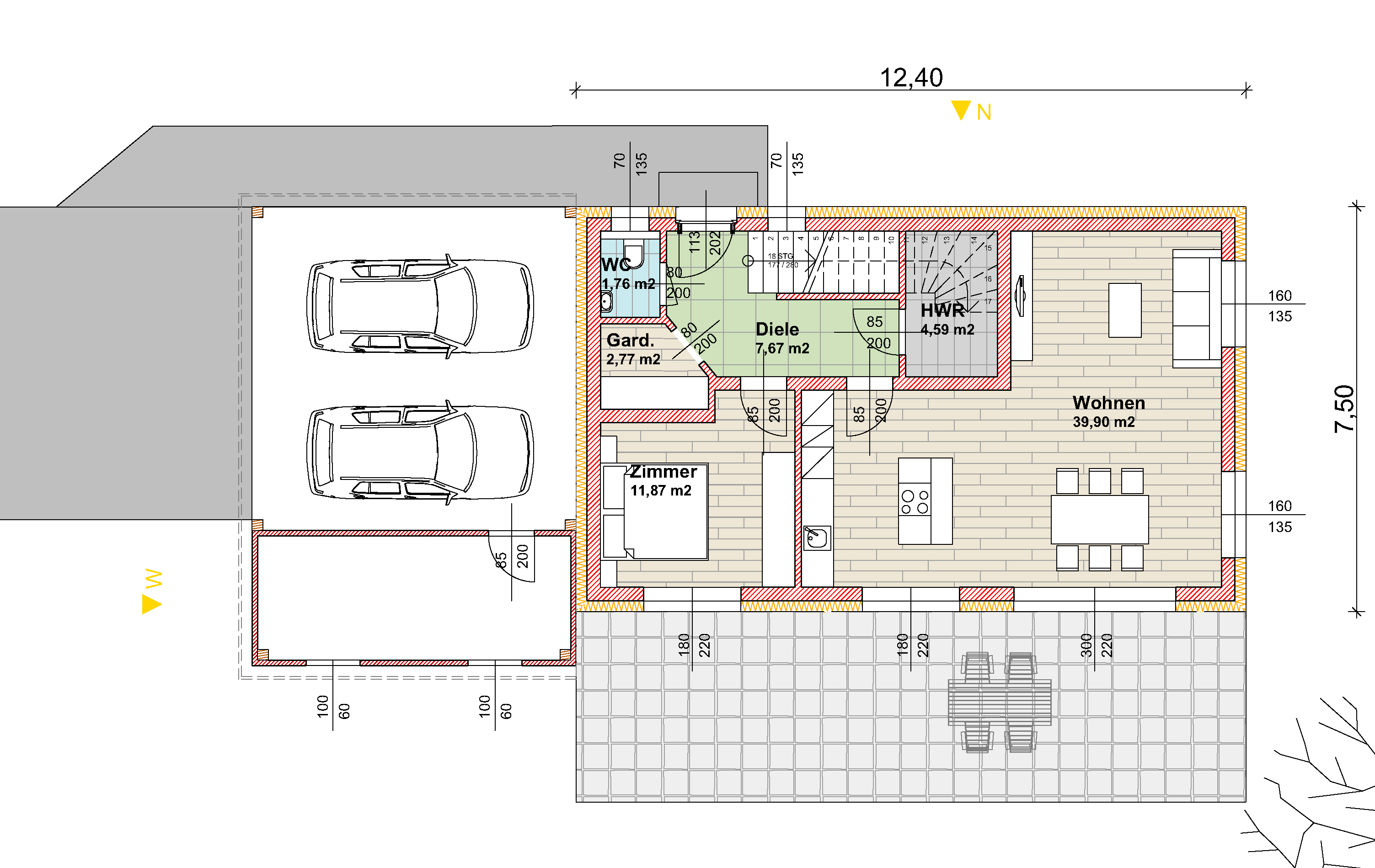 Beheizt wird mittels einer Luftwärmepumpe. Im Wohnbereich sorgen elektrische Raffstores für das richtige Maß an Sonneneinstrahlung, in den Zimmern sind Rollläden vorgerichtet.